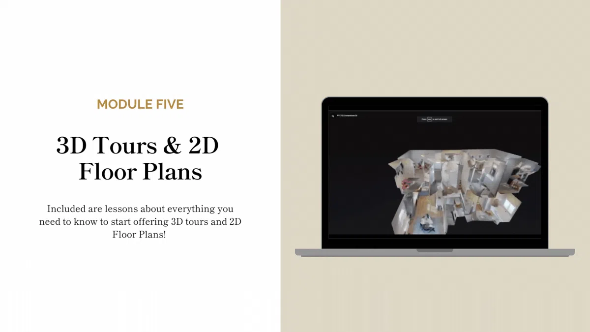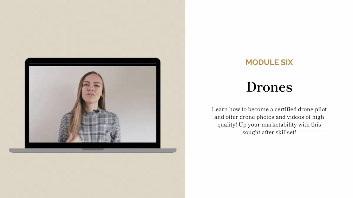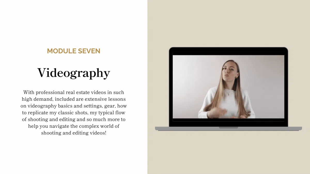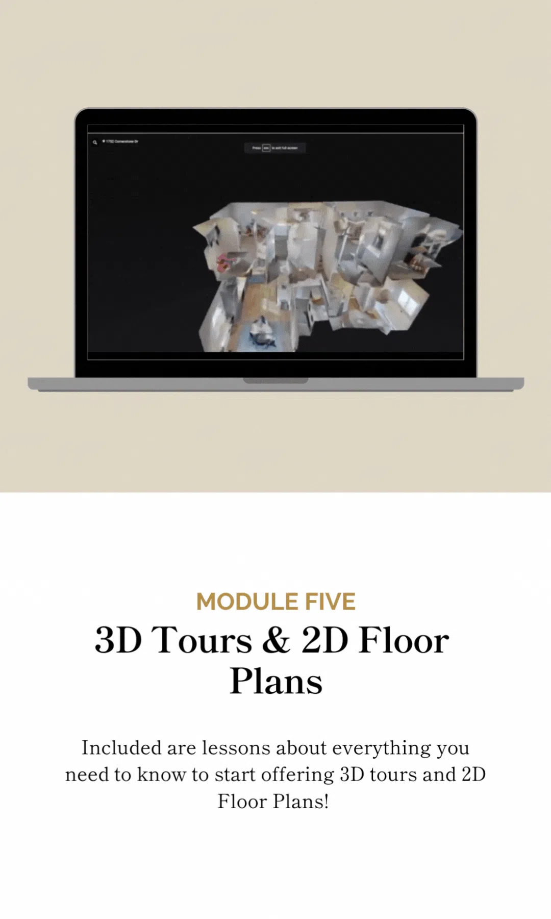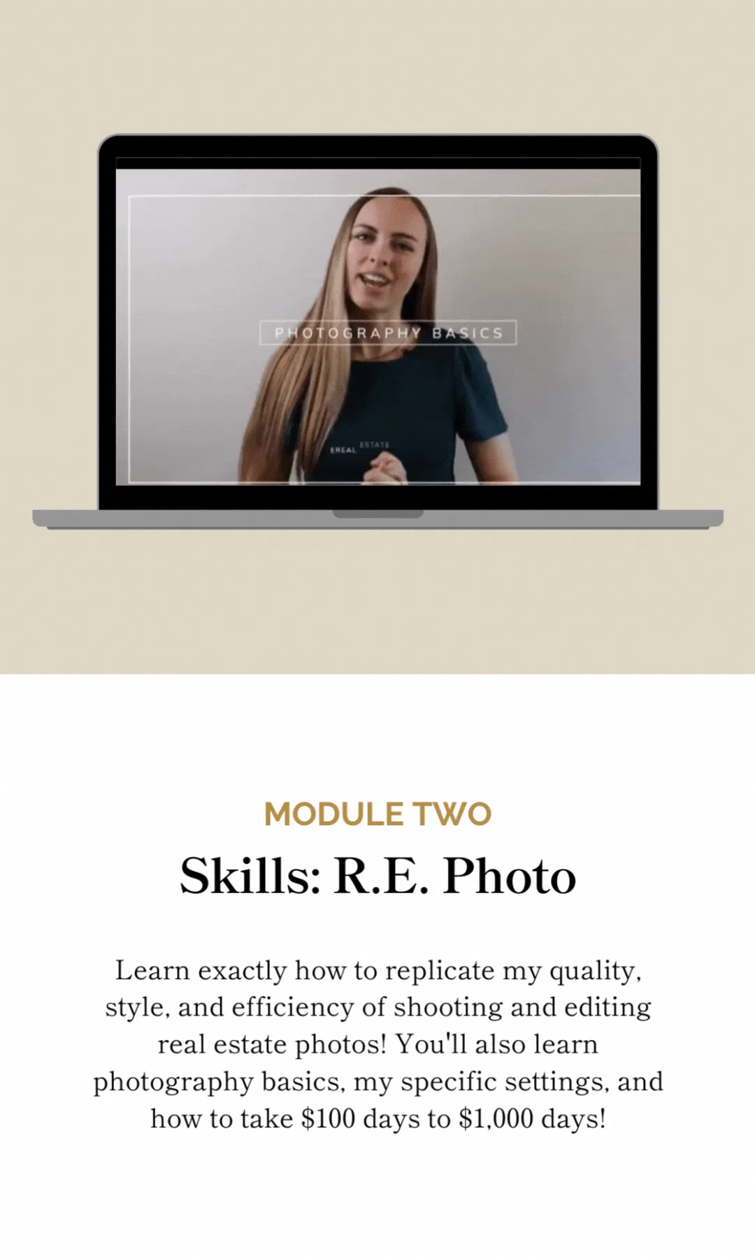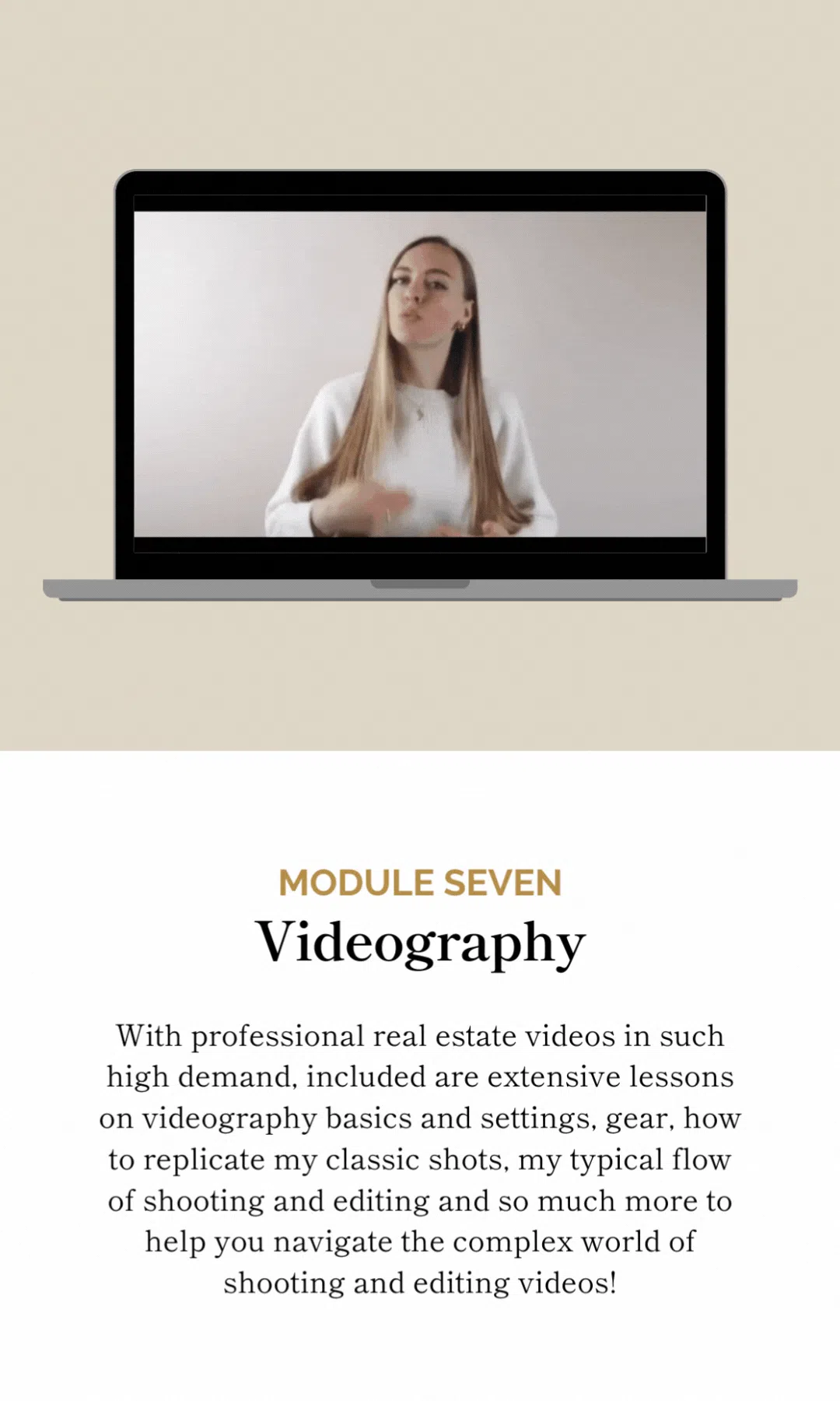 Are pre-recorded video lessons organized in digestible modules. These lessons have been designed to make it clear, simple and as quick as possible to take your real estate photography business to it’s fullest potential! Check out the modules and what's included below!