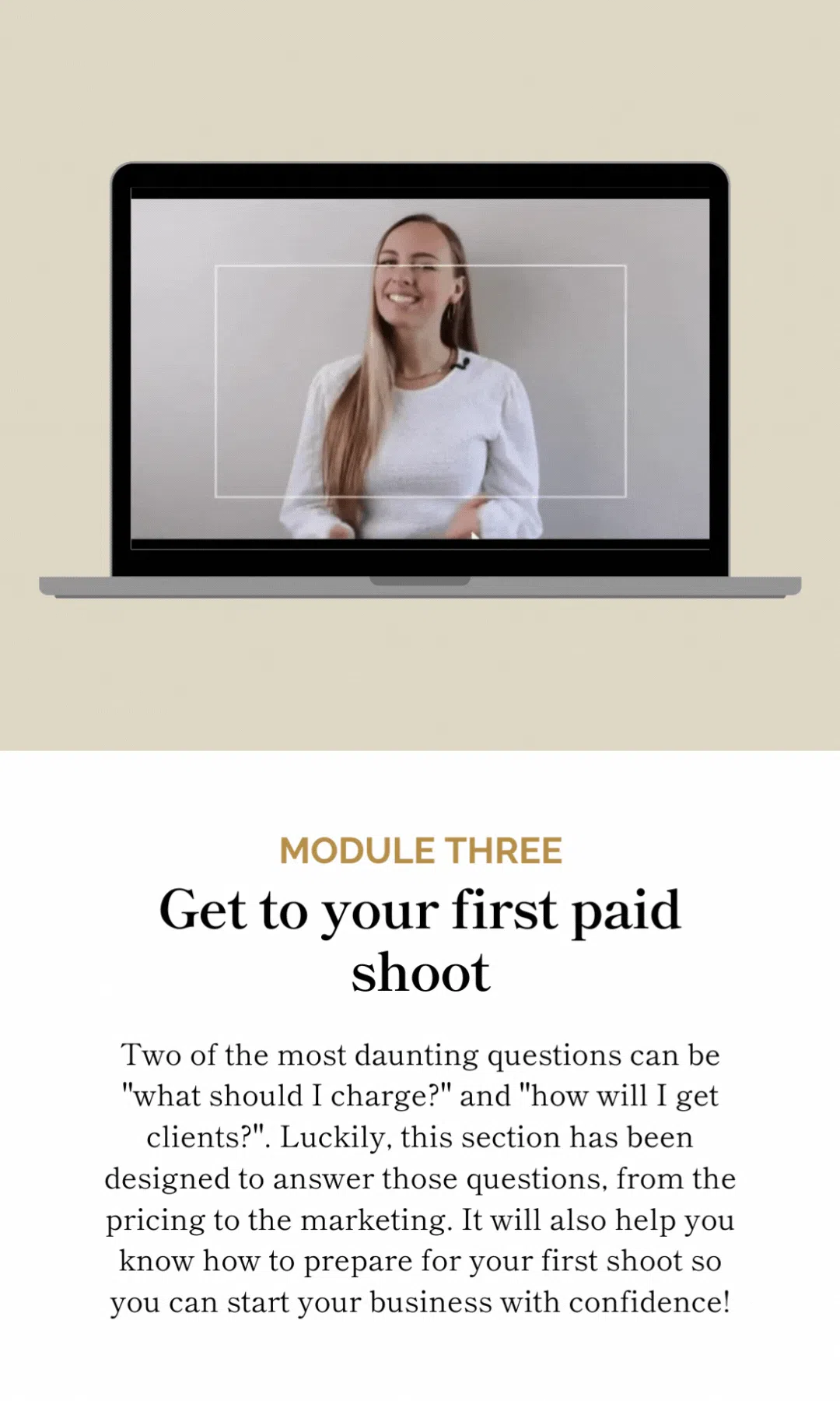 “First of all, Lindsay is an amazing person! Secondly, her class is so cool. It is a great opportunity to learn either a new skill for a temporary job or side hustle, but also gives a thorough walk-through on how to make it your business and profit! The classes are all engaging and informative, and I cruised through most of them in a few days because her enthusiasm for the profession is contagious. It is amazing to see how little experience I had, and yet with just a little practice after Lindsay’s teaching, I can already make beautiful photographs. I love that the class is a go at your own pace, and that Lindsay has done such extensive research to make everything easier on us. The class is a gold-mine of reliable and valuable information. She is always both encouraging and I daresay inspiring in her video lessons, as well as when you contact her personally. Highly recommend!"