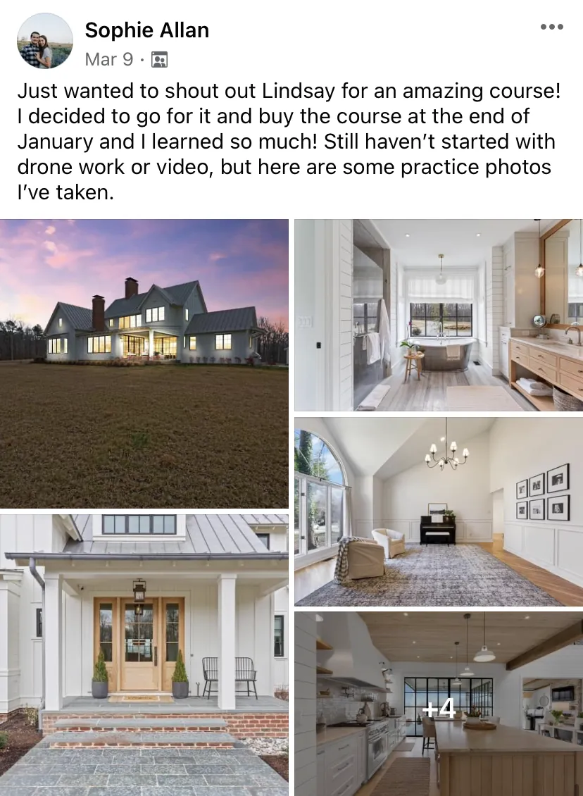 “I have loved learning about the ins and outs of real estate photography and Lindsay has done a great job explaining things so it's easy to understand. It's made me excited to start my own business!”